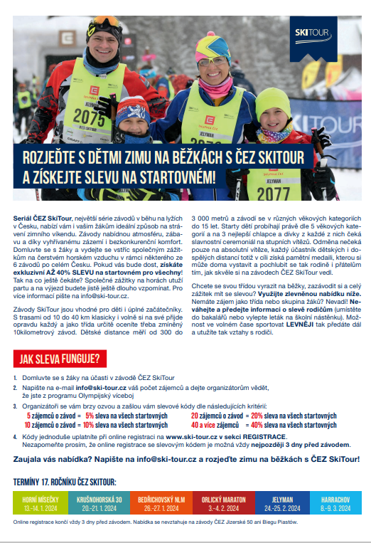 Seriál ČEZ SkiTour, největší série závodů v běhu na lyžích v Česku, nabízí vám i vašim žákům ideální způsob na strávení zimního víkendu. Závody nabídnou atmosféru, zábavu a díky vyhřívanému zázemí i bezkonkurenční komfort. Domluvte se s žáky a vydejte se vstříc společným zážitkům na čerstvém horském vzduchu v rámci některého ze šesti závodů po celém Česku. Pokud vás bude dost, získáte exkluzivní AŽ 40% SLEVU na startovném pro všechny!